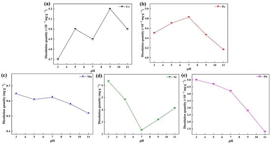 It can be seen from Figure 11a that Cr in cyanobacteria-sediment-based ceramsite had a higher dissolution at pH 5 and 9. Cr is prone to hydrolysis, therefore increases dissolution under acidic or alkaline conditions. The hydrolysis reaction is reversible, therefore the dissolution is reduced under the conditions of excessive acid or excessive alkali. It can be seen from Figure 11b that Fe in ceramsite increased first and then decreased with the increase of pH value. When the pH value was 7, the dissolution of Fe reached 4.83 × 10−2 mg·g−1. Fe is an important part of ceramsite sintering in the firing process, mainly in skeleton construction. Under acidic and alkaline conditions, the structure is not easily destroyed and the dissolution amount is small. It can be seen from Figure 11c that the Mn in the ceramsite showed a gradual decrease with the increase of the pH value. When the pH value was 7, the dissolution of Mn slightly increased. Mn exhibited an ion-exchangeable state under acidic conditions. When the pH value gradually increased, Mn and OH− in the solution formed a white precipitate, resulting in less Mn dissolution. It can be seen from Figure 11d that Ni in the ceramsite decreased first and then increased with the increase of the pH value. The reason may be that under stable acid conditions, the crystal form of Ni was destroyed, resulting in increased dissolution. Under alkaline conditions, the competitiveness of Ni was weaker than that of other substances in the clay, which reduced the dissolution. It can be seen from Figure 11e that the Pb in the ceramsite showed a gradual decrease with the increase of the pH value, because Pb2+ combines with OH− in an alkaline environment to form precipitation and fixes in the pore structure of ceramsite, which made the ceramsite dissolve less under alkaline conditions [].