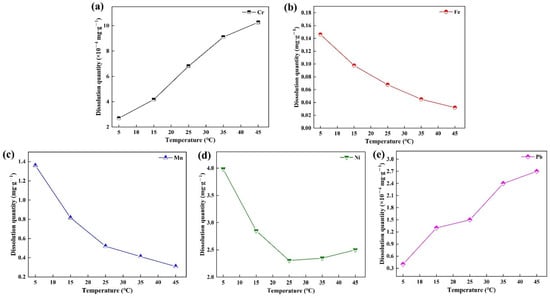 It can be seen from Figure 12 that Cr and Pb in cyanobacteria-sediment-based ceramsite showed a gradual increase with the increase in temperature. The dissolution of Fe, Mn, and Ni decreased with the increase in temperature. The increase in temperature made the water-soluble or carbonate-bound metals on the surface of ceramsite dissolve and then the dissolved amount increased. The gradual decrease of Fe, Mn, and Ni was mainly due to the complexation of Fe, Mn, and Ni with the inorganic ligands on the surface of the ceramsite with the increase in temperature. After the subsequent filtration of the filter membrane, the complex was intercepted on the filter membrane’s surface, which made it decrease with the increase of temperature [].