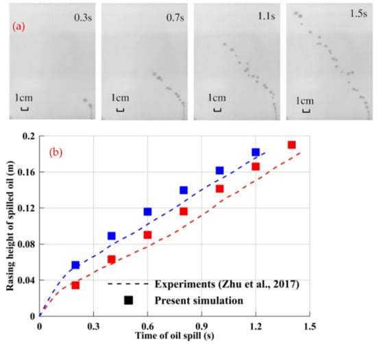 The model’s accuracy was verified according to the underwater oil spill experiment results of Zhu et al., as shown in Figure 3. The modeling method adopted in this paper was used to establish a matching numerical model regarding the experimental geometric conditions and oil physical properties. As seen in Figure 3, the simulation results based on the VOF model were in good agreement with the experimental results. Therefore, the numerical results were reliable and can be used to study the diffusion law of underwater oil spills.