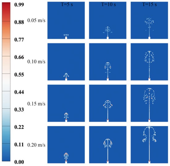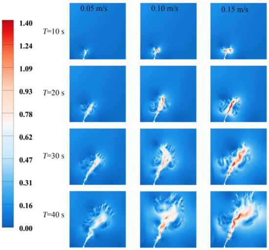 Firstly, the change of oil spill morphology with time at different oil spill velocities when U0 = 0 m/s is obtained, as displayed in Figure 4. The time variable is shown horizontally, and the oil spill distribution at T = 5 s, T = 10 s, and T = 15 s is shown from left to right. Longitudinal is the variable of oil spill velocity; that is, each row represents the cloud map of oil spill concentration distribution when the oil spill velocity is 0.05 m/s, 0.10 m/s, 0.15 m/s, and 0.20 m/s, respectively, and the oil spill velocity increases from top to bottom.
