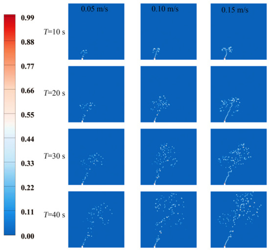 The ocean current velocity is the main factor affecting the diffusion of spilled oil. Ocean current can accelerate the dilution and purification of pollutants due to their rapid diffusion and correspondingly expand the scope of pollution. The change of oil spill diffusion morphology with time under different ocean current velocities is obtained when the oil spill velocity is Up = 0.15 m/s, as shown in Figure 5. Among them, longitudinal is the time variable; that is, each line from top to bottom represents the oil–water distribution when the time point is T = 10 s, T = 20 s, T = 30 s, and T = 40 s, respectively; the horizontal is the maximum current velocity; that is, each column represents the oil spill distribution with the maximum current velocity of 0.05 m/s, 0.10 m/s, and 0.15 m/s, respectively.