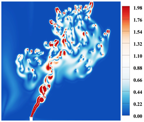 On this basis, the vorticity distribution characteristics of the spilled oil at T = 40 s are obtained, as shown in Figure 7. With the continuous overflow of crude oil from the wellhead, the oil spill trajectory has a centralized effect. The ocean current has a significant impact on the horizontal diffusion of the spilled oil, resulting in the dispersion effect of its motion trajectory. The main body of spilled oil inclines to the right and diffuses upward under the action of the transverse current, and a small part of the spilled oil diffuses to the left under the action of free drift; in the initial stage of the oil spill, the spilled oil is mainly distributed as dispersed oil droplets and oil blocks. With the increase of oil spill degree, a large number of continuous oil masses and oil belts also increase, the range of underwater pollution will also increase, and the more significant current velocity will also promote the growth of oil droplets.