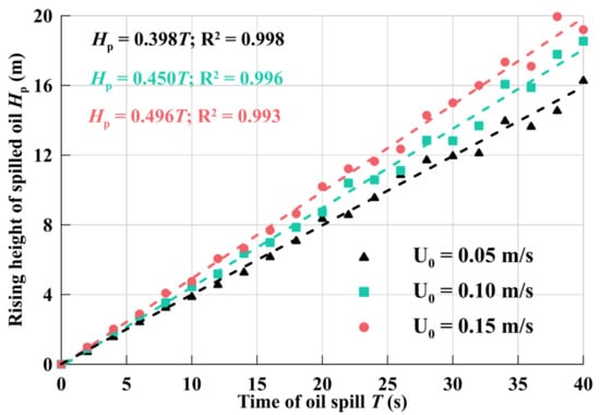 The rising height Hp under different maximum current velocities is compared, as shown in Figure 8. In the first 5 s, the spilled oil has approximately the same rising height because the oil spill leaked from the wellhead has relatively large inertia, which exceeds the shear effect of the ocean current. The crude oil is dispersed or combined under the joint action of gravity, inertia force, buoyancy, and shear stress, and its size changes with time. At the same time, with the growth of rising height, the viscous shear force gradually weakens the inertia force of the spilled oil. With the increase of Hp to 5 m, the shear effect of the ocean current begins to strengthen, and the greater the velocity of the ocean current, the more shear stress and kinetic energy it exerts on the spilled oil, thus the rising height of the spilled oil is slightly increased.