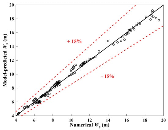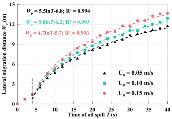 According to the above analysis, the lateral migration distance Wp is an important index to determine the impact range of an oil spill, so it is necessary to provide the variation of Wp with oil spill time under different working conditions. According to the numerical simulation results, the lateral migration distance Wp at different times under various working conditions is obtained, and the parameters are fitted, as seen in Equation (11). It is satisfied between the oil spill time and various influencing factors, and the power relationship between the oil spill lateral migration distance Wp and various influencing factors.