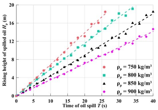 The variation of the rising height Hp under different crude oil densities is obtained, as shown in Figure 10. The crude oil density affects the diffusion speed and diffusion range in seawater. The greater the density, the longer it takes crude oil to diffuse from the seabed to the sea surface. When ρp = 750 kg/m3, the leaked oil diffuses from the leaking wellhead to the sea surface in about 28 s. When ρp = 900 kg/m3, the rising distance of the spilled oil is 9.7 m at T = 28 s, which is 10.3 m different from the crude oil with a density of ρp = 750 kg/m3 at the same time. This is because the higher the density of crude oil with the same volume, the greater the gravity and the same buoyancy. Therefore, the vertical upward force on high-density crude oil is smaller, and the rising speed is slower.