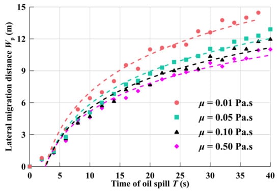 The variation of crude oil lateral drift distance Wp with time under different crude oil viscosities is obtained, as displayed in Figure 13. The greater the viscosity of crude oil, the smaller the lateral diffusion distance in seawater. At μ = 0.01 Pa.s, the lateral migration distance of the leaked oil in the seawater after about 28 s is 13.6 m, when μ = 0.50 Pa.s at T = 28 s, the lateral diffusion distance of the spilled oil is 11.1 m, and the viscosity at the same time is μ = 0.01 Pa.s and crude oil has a difference of 2.5 m. The increase of the viscosity will reduce the diffusion speed and drift speed of the spilled oil, and the oil mass with high viscosity will also block the drift and dispersion of the spilled oil. Therefore, the thickness of the oil film in the high-viscosity spilled oil is relatively thick; The slower diffusion speed provides more response time for oil spill emergency response.