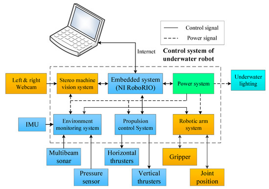 Figure 2 shows the system architecture diagram of the ROV, which includes two parts: onshore and underwater controls. The onshore management comprises the power source and a laptop with a human–machine interface (HMI). The onshore operator can obtain underwater information and operate the ROV through the HMI. Additionally, the operator can use the joystick to operate the ROV directly. The underwater control part is in the ROV body. There is an embedded system (NI-roboRIO) in the watertight compartment of the ROV, which is the control center of the ROV. The embedded system interlinks with the following systems: stereo machine vision system, environment monitoring system, propulsion control system, robotic arm system, and power system.