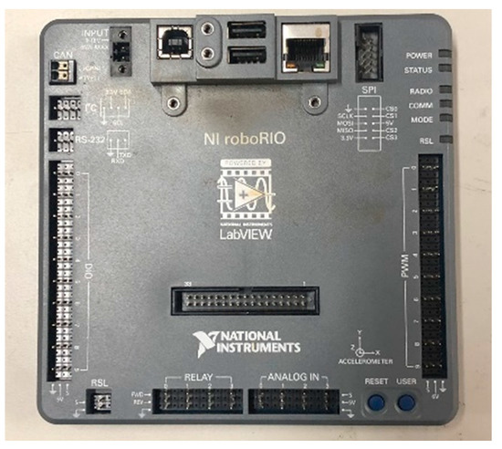 In this study, the control center of the ROV was the roboRIO embedded controller shown in Figure 3, provided by National Instruments (NI) headquartered in Austin, TX, USA. The built-in communication interface of NI-roboRIO includes an Inter-Integrated Circuit (I2C), Serial Peripheral Interface Bus (SPI), RS-232, USB, Ethernet, the connection between pulse-width modulation (PWM) and relay, and standard sensors and actuators used by robots. The customizable control system can be developed and designed by the Laboratory Virtual Instrumentation Engineering Workbench (LabVIEW) or C programming language, with a built-in dual-core ARM Real-Time Cortex-A9 processor and Xilinx FPGA. Therefore, the HMI in this study was designed using the LabVIEW graphic control program.