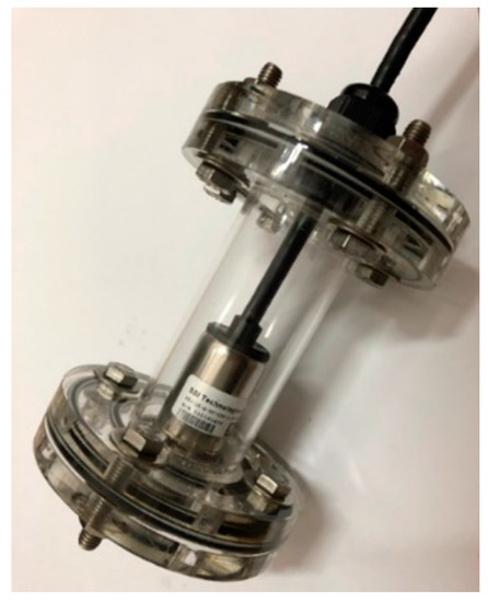 To measure the depth position of the ROV, the P51 pressure sensor produced by Samurai Spirit Inc. (SSI, Taipei, Taiwan) was used in this study to measure the position pressure and convert it into the depth of the position. Figure 5 shows the physical appearance of the exposed pressure sensor, and Figure 6 shows the pressure sensor with the watertight enclosure. The specification of the pressure sensor is shown in Table 2. The power supply used by the pressure sensor is 5 V voltage provided by NI-roboRIO. The pressure and voltage at the current position returned by the pressure sensor are read and converted into the actual depth of work in the monitoring system through the analog input port of NI-roboRIO. After regression analysis of the measured voltage and the pressure sensor’s depth of position, the relationship between the measured voltage and water depth can be expressed as follows: