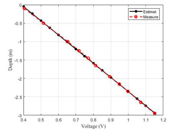 In Figure 7, the red curve shows the relationship between the measured voltage and water depth. The black curve shows the relationship between the estimated voltage and water depth by Equation (5). The HMI development software of the ROV used in this study was LabVIEW, a graphical program compiling platform developed by NI. HMI is an essential platform for communication between the operator and ROV. The main functions of HMI include underwater information acquisition, thruster control, and data collection. The HMI of the ROV designed in this study is shown in Figure 8, in which Area 1 offers the selection to exit the HMI, the thrusters’ startup/shutdown, mission mode selection, the change of task execution, and the display of depth value. Area 2 is the attitude gauge used to indicate the ROV’s attitude angle through the accelerometer value. The current horizontal attitude of ROV can be visually displayed. Area 3 illustrates the propulsion state of each thruster, which is rotating clockwise or counterclockwise. Area 4 is the trajectory chart of the target depth vs. the current depth. Area 5 provides an interface to operate the ROV to move forward, backward, dive down, and float up as well as the steering and translation movement. Area 6 offers the speed adjustment of each thruster, respectively.