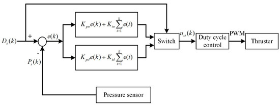 An ROV is easily affected by buoyancy and water flow, which change the stable status of the ROV. To overcome the influence of these disturbances on ROV, we adopted the switch PI controller combined with a buck-boost converter (BBC) to follow the desired trajectory of the ROV. Figure 9 shows the flow chart of the proposed control system, among which is the desired depth of the position of the ROV, is the current depth of position of the ROV measured by the pressure sensor, and is the state error of the system. The ‘switch’ block was designed to select the output of an appropriate PI controller through the input state. Then, the system generates the corresponding PWM through the BBC to drive the ROV’s vertical thruster in a self-synchronous manner, so that the ROV can drive itself to the designed trajectory position. According to the designed floating-up and diving-down trajectory, the output of the switch PI controller was designed as follows: