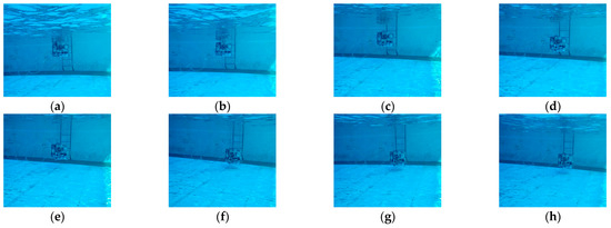 Station-keeping experiment. (a) Start diving at the depth of −0.3 m. (b) Dive to −0.4 m. (c) Dive to −0.5 m. (d) Dive to −0.6 m. (e) Dive to −0.7 m (f–h) Station keeping at −0.75 m.