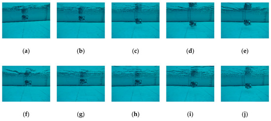 Sine-wave heaving experiment. (a) Start diving at the depth of −0.2 m. (b) Dive-down to −0.4 m. (c) Dive-down to −0.6 m. (d) Dive-down to −0.8 m. (e) Float-up to −0.6 m. (f) Float-up to −0.4m. (g) Float-up to −0.2 m. (h) Dive-down to −3 m. (i) Dive-down to −0.45 m. (j) Dive-down to −0.65 m.