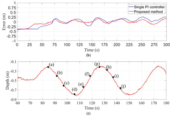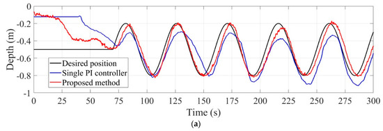 The sampling time was 10 ms. The proposed switch controller selects the parameters according to the floating-up or diving-down state and drives the vertical thruster via BBC control. Figure 12 illustrates the pictures taken during trajectory tracking by the switch PI controller, Figure 13a displays the response depth curve of ROV during trajectory tracking, and Figure 13b depicts the response trajectory error. In the above illustration, the blue response trajectory curve is under the traditional PI control, and the red response trajectory curve is under the proposed switch PI control. Figure 12 shows that the ROV can heave up and down according to the desired sine-wave signal. Furthermore, the response curves of Figure 13a demonstrate that the traditional single PI controller cannot operate the ROV to float up to the given trajectory position and the ROV leads to the sinking tendency. According to the trajectory error in Figure 13b, the average difference of a traditional single PI controller was 0.1594 m, and that of the control method proposed in this study was 0.0997 m. Figure 13b also shows that the ROV with a traditional single PI controller cannot keep up with the design trajectory signal and tends to sink slowly. Figure 13c enlarges the depth curve of the proposed method in Figure 13a and shows the relation between each tracking position and the actual scene in Figure 12. The video link of the experiment is available in Supplementary Materials.