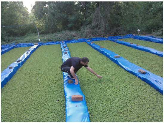In contrast, the deployment of macrophytes in biorefineries has been to a much lesser extent so far. Only the free-floating aquatic weed pistia (Pistia stratiotes) has been explored in the context of a biorefinery aiming wastewater treatment [6,7]. However, the system reported by the authors—a 13,000 L lagoon filled with polluted river water—was rather slow in affecting significant treatment. It required a hydraulic retention time (HRT) of 7 days which is indicative of about 28 times slower rate of treatment than achievable by conventional wastewater treatment systems (CWTSs) based on activated sludge process (ASP) and its variants. The only other reported study referring to a macrophyte in the context of a biorefinery is also on a free-floating aquatic macrophyte duckweed (lamnacae) by Calicioglu et al. [8,9], but it describes only a hypothetical biorefinery with no details on the extent of wastewater treatment achievable, or any form of experiment-based validation.