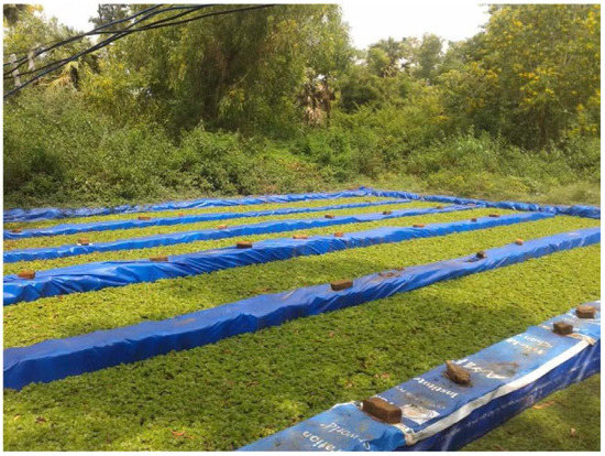 (b) Conversion of the biomass, remaining after the VFA extraction, into organic fertilizer, invoking the novel high-rate vermicomposting paradigm, and the technology developed on its basis [45,46]. The technology enables direct and rapid conversion in to high quality organic fertilizer of botanical species, such as Salvinia molesta [47] and Azadiracta indica [48]. The process occurs at rates 3–4 times faster than possible with conventional vermicomposting systems. Equally importantly, such rapid vermicomposting is achieved without the need of any pre-treatment or manure/enzyme/nutrient supplementation, thereby improving the process economics. Further, the process makes it possible to convert even toxic and allelopathic weeds like Prosopis juliflora, Ipomoea carnia, Lantana camera, and Parthenium hysterophorus to benign organic fertilizers [49,50,51,52,53]. Hence by attaching a vermicomposting step downstream SHEFROL® units, the system can be transformed into a biorefinery in which partly treated sewage can be polished using one or other of the three macrophytes, and the spent/grown biomass of the macrophytes can be converted into organic fertilizer, leaving no net waste to dispose.