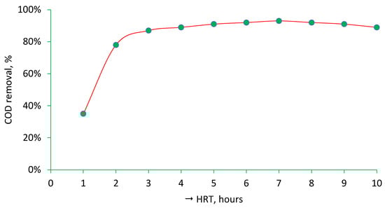 The reactor was run at HRTs of 1, 2, 3, 4, 5, 6, 7, 8, 9, and 10 h. With the channel volume being constant, the HRT was varied by varying the influent flow rate. This, in turn, was achieved by appropriately adjusting the influent liquid head at the entry point.