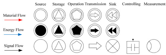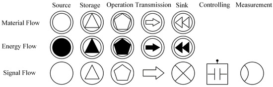 The flow functions are classified for the different actions. ‘Source’ characterizes the ability of the technical system to provide input flows. ‘Storage’ describes the ability of the system to accumulate and store flows in the sequence of events. ‘Operation’ refers to the ability of the system to balance input and output flows and accomplish the goal. ‘Transmission’ refers to the ability of the system to transfer flows from the previous functional unit to the next. ‘Sink’ indicates the ability of the technical system to receive flows. In addition, signal flow also has two functions, ‘Measurement’ is the ability of the system to convert physical measurements into information, and ‘controlling’ is the ability of the system to convert information into physical results. The specific classifications and symbols are shown in Figure 2.