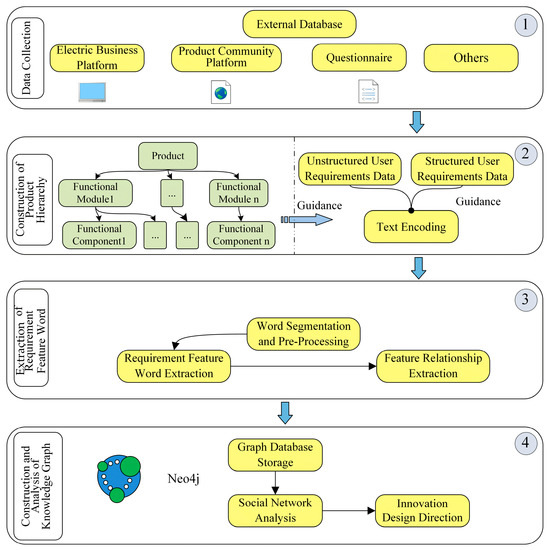 User functional requirements (hereafter the same as user requirements) are the requirements and desires of users to achieve the functions of the product. The purpose of this section is to use the capability of data visualization of a knowledge graph to express relevance, establish the connection between product functions and user requirements, and determine the direction of product innovation from the view of the majority of users, which has practical significance for guiding product design. The process of constructing the user requirements knowledge graph is shown in Figure 4, and the specific steps are as follows.