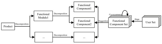 - Construction of Product HierarchyThe purpose of constructing the product hierarchy is to classify the user functional requirements text data hierarchically. The construction of the product hierarchy is divided into three types: manual construction, semi-automatic construction, and automatic construction [58]. The construction process of the product hierarchy should indicate the functional structure relationship between product-functional and module-functional components. Since the study of the conceptual hierarchy of products is mostly conducted from the perspective of functional decomposition, the manual construction method is mainly used. Based on the reverse fishbone, the product function is decomposed to build a product hierarchy level.Decomposition of products into functional modules, as shown in Equation (2) [36].where is the target product, is the functional module of the target product, and . Thus, the above equation can be expressed from the functional components [36]:where is the functional component of the functional module of the product, .Since users’ functional requirements for the product only stay on the surface of the popular functions, and few of the requests are related to the functional components of the product, the user requirements text processing can realize the classification of user requirements by the functional component level of the product (see Figure 5). At the same time, the processing of user requirements text can also modify the constructed product hierarchy.