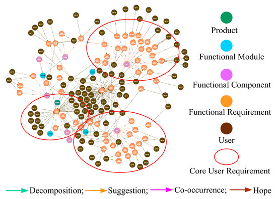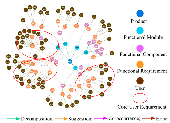 - Construction of Knowledge GraphKnowledge graphs are constructed in two ways: bottom-up and top-down [62]. The bottom-up approach is a data-driven approach, which is applicable to open domain knowledge graphs. The top-down construction is mostly applied to industry-specific vertical domains, and can meet the requirements of professionalism, complex and changeable business requirements, and high-quality data. The top-down construction of the knowledge graph is used for known products.The user requirements knowledge graph defined in this paper consists of five nodes: user, requirement, functional component, functional module, and product. Corresponding relationships need to be established among each node. The relationship between feature words of functional requirements is co-occurrence. The product is decomposed into each functional module, and the functional module is decomposed into functional components. The functional requirements suggest that the functional components have what the user wants. According to the relationship between the nodes, the model of a user requirement knowledge graph can be constructed, as shown in Figure 6.
