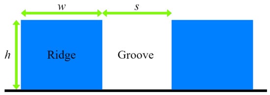 The present study continues our previous work [25], where the earlier described LBM model was validated on a 2D sessile droplet and a two-fluid stratified Poiseuille flow. The present study further analyzes the droplet spreading on a roughened surface represented by horizontal and vertical groove-ridge patterned surfaces. Firstly, the static contact angle on the groove-ridge surface was measured and compared with the theoretical contact angle determined by Equations (1) and (2) to prove the validity of the LBM code used in the study. The equivalent surface roughness r was defined by; where w and h are the ridge width and height, and s denotes the spacing between the ridges, as shown in Figure 1. The static contact angle is prescribed for the flat surface, as in our previous work [25]. The solid fraction in Equation (2) was determined by . As explained in the next section, changing the groove-ridge dimensions triggered the Cassie–Baxter and Wenzel wetting states.