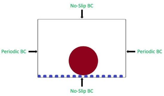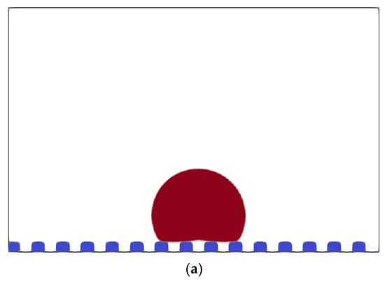 The horizontal grooved-ridged surface is firstly studied without including gravitational effects. As indicated in our previous work [25], a 2D liquid droplet is placed at the chamber’s center, surrounded by an immiscible background fluid. The domain geometry, initial, and boundary conditions are shown in Figure 2, with the weightless droplet in its initial state. Hence, a droplet with a radius of 20 lattice units (lu) was placed in the middle between two contiguous ridges. The no-slip boundary condition (BC) is imposed on the top and bottom walls, whereas periodic BCs are prescribed on the left and right sides of the domain. The no-slip boundary condition is applied by reversing the distribution function on each wall node , , where j is the direction opposite to the initial direction i, so . The periodic boundary condition is applied by translating the values of the probability distribution function at the boundary node to the opposing side node , preserving the directions, .