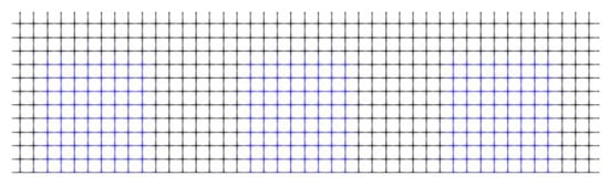 The required verification of the domain discretization was conducted before validating the numerical findings using a progressive grid refinement method. The grid highlighted on top of the grooved wall geometry is shown in Figure 3. The domain height (y-direction) was discretized with a fixed medium resolution of 101 lu-grid because the vertical grid size was not expected to affect Wenzel’s contact angle, as it greatly depends on the x-discretization. As a result, the horizontal grid size (x-direction) was the focus of the grid verification. The domain’s x-grid was refined by 33% twice (see Table 1). The contact angle at the Wenzel state between the first and second grid had a relative error of 0.14% and a much smaller error between the second and third grids; hence, the computational domain with a size of 151 × 101 lu2 was chosen for subsequent static wetting regime simulations.