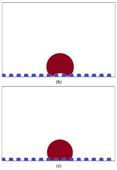 In the present study, the aspect ratio featured in the initial set-up was equal to 1 (w = 5 lu, s = 5 lu), and the Wenzel state was obtained. This outcome was expected since the sum of groove-ridge geometrical parameters perfectly matches the theoretical expectation [25]. Therefore, the width and spacing were increased to 10 lu and 6 lu, respectively, leading to an aspect ratio of 1.67. The new groove-ridge dimensions added up more than the droplet radius (10 + 6 + 5 = 21 lu > 20 lu), causing a metastable Cassie–Baxter state (see Figure 4) after oscillations between the Cassie–Baxter and Wenzel states for several thousands of time-steps. Further, the width was increased to 15 lu, and the spacing decreased to 5 lu, thus, resulting in an aspect ratio of 3 with unchanged height. The metastable Cassie–Baxter state settled up again, meaning that the occurrence of this state does not depend solely on the aspect ratio but also on the size of the ridge. Therefore, the height was increased to 10 lu, and the width was decreased to 10 lu; although spacing has not changed, the droplet ends up in a classical Cassie–Baxter state. The height was reduced to 9 lu while keeping the other parameters (s = 5 lu, w = 10 lu) to determine the critical value of the ridge height that can produce a Cassie–Baxter state. However, the metastable Cassie–Baxter state was obtained. Based on these findings, it is reasonable to deduce that the following three conditions must be met to produce the Cassie–Baxter state for a droplet immersed in a background fluid with unit density and viscosity ratios: