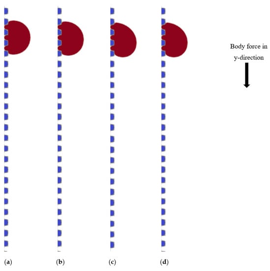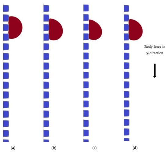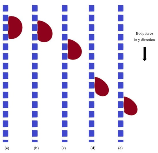 where s = 0 denotes a fluid node, s = 1 denotes a solid substrate, and is the wettability factor, also known as the solid–fluid interaction parameter, which indicates the strength of the interaction between the solid and fluid. A non-wetting fluid–surface contact has a positive , while a wetting fluid–surface interaction has a negative [26]. A body force is used to create a flow in vertical cases:
