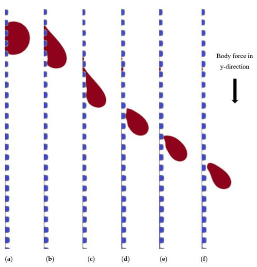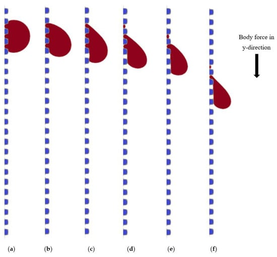 Slipping regime of the Wenzel state (Bo = 0.891; h = w = s = 5 lu, R = 20 lu). Images are taken at (a) initial time; (b) 2000 time-steps; (c) 5500 time-steps; (d) 12,000 time-steps; (e) 14,000 time-steps; (f) 16,000 time-steps.