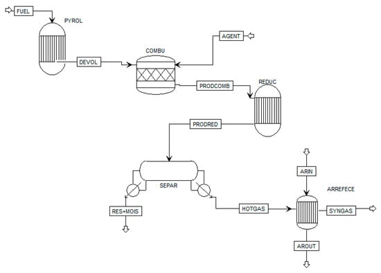 Figure 1 shows the flow diagram of the gasification model implemented in Aspen Plus™ software. The fuel flow (FUEL) enters the pyrolysis reactor (PYROL), which simulates the devolatilization of the OILSLU stream through a routine developed in Fortran based on ultimate and proximate analysis of the fuel [28], producing the DEVOL stream, which is composed of volatiles and char. The DEVOL flow goes to the oxidation/combustion reactor (COMBU), which simulates the partial oxidation and char gasification reactions occurring in the process, where the gasification agent (AGENT) is also supplied. The oxidation products (PRODCOMB) are sent to the Gibbs reactor (REDUC), where the reduction reactions occur. Subsequently, PRODRED stream enters the separator SEPAR, which has the function of separating the acid gases, ash, and moisture fractions (RES + MOIS), producing HOTGAS stream, which is cooled down to a temperature of 25 °C to obtain the producer gas stream (SYNGAS). SEPAR considers the method of adsorption using iron oxides, which removes hydrogen sulfide by forming insoluble iron sulfides [29]. The unit operation blocks used in the gasification model are presented in Table 3.