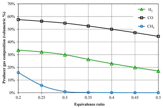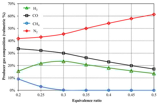 The producer gas obtained from the co-gasification process using air as a gasification agent reach a significant content of H2 (23.7% for ER = 0.3) and other compounds such as CO and CH4, which contribute to the increase of producer gas LHV. Thus, Figure 4 shows the expected composition profile in the producer gas obtained after co-gasification as a function of ER. In general, it was observed that the increase in ER favors the thermal cracking and reforming steam reactions, reducing the concentration of CH4 (varying from 9.1% to 3.0%), although a higher concentration of H2 and CO were obtained in the same ER range (between 0.2 and 0.3) [46].