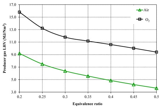 Regarding producer gas LHV, a decreasing trend was observed as ER increased until reaching values that oscillate in the range of 6.37 and 3.63 MJ/Nm3 for ER values greater than 0.30 when using air as the gasification agent (see Figure 6). This behavior is associated with a higher amount of gasification agent supplied, which favors the reforming and thermal cracking reactions of the heavier organic fractions contained in heavy oil. Thus, lighter hydrocarbons are produced with lower energy content, leading to a mixture of lighter combustible gases and consequently decreasing the LHV [47]. Otherwise, the oxygen co-gasification case presented better results of LHV, decreasing from 11.79 to 9.40 MJ/Nm3 (for ER greater than 0.3), associated with higher concentrations of H2, CO, and CH4.