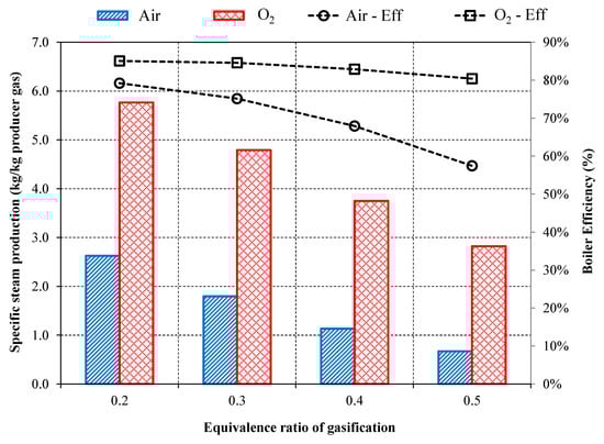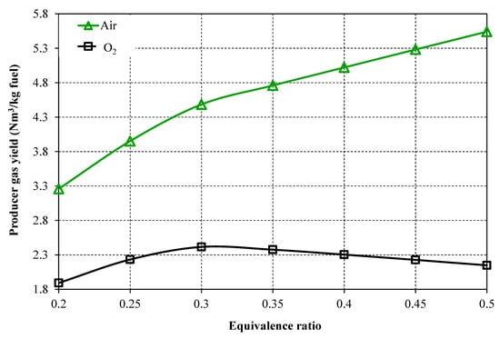 Another critical parameter in gasification is related to the producer gas yield, which has an increasing trend as the ER values increase, as shown in Figure 7 and reported by Upadhyay et al. [48] and Pandey et al. [49]. Considering an ER of 0.30 for the air co-gasification case, the producer gas yield is expected to be around 4.48 Nm3/kg fuel. However, as the amount of gasification agent injected into the reactor increases, the decomposition and reformation of heavier hydrocarbons are favored, and consequently, a greater amount of gas per unit of fuel mass is generated [50]. For the oxygen co-gasification case, there exists an inverse relationship between producer gas LHV and the yield since greater values of the LHV lead to a smaller volume produced of gas per unit of dry fuel fed due to the partial removal of nitrogen from the provided gasification agent.