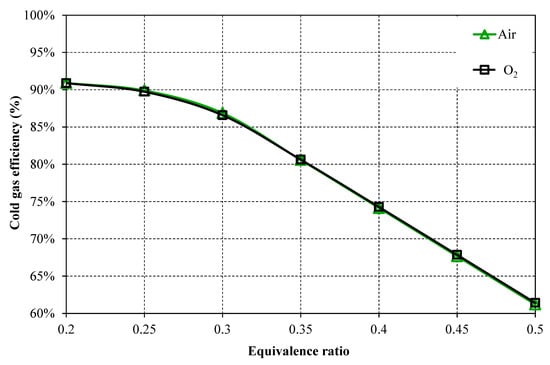 The cold gas efficiency (CGE) of the gasification process is calculated considering the values obtained from the LHV and producer gas yield, as presented in Figure 8. As can be seen, for the analyzed ER range, the CGE of the co-gasification process decreases from approximately 91% to 61%, for both cases. This behavior occurs because a greater supply of oxidant (air or O2) favors the production of CO2, leading to a decrease in the composition of combustible gases in the producer gas. The reduction is slightly higher for air co-gasification due to the N2 present in the air, which will also be part of the producer gas composition as it is a chemically inert compound [51].