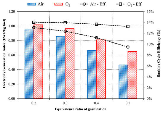 The syngas yield corresponded to 4.48 Nm3/kg-fuel when the air was used (ER = 0.3); thus, it could be appropriate to mention that the syngas yield increased due to the cracking of heavy chemical compounds present in the fuel mixture composition. For co-gasification with oxygen, an inversely proportional relationship was observed between the LHV and the yield of the syngas, in this case, as the LHV increases (0.3 to 0.5 MJ/Nm3), the amount of gas produced decreases (2.4 to 2.2 Nm3/kg). On the other hand, co-gasification with oxygen presented a higher electricity production rate (1.02–0.65 kWh/kg fuel) compared to co-gasification with air (0.95–0.46 kWh/kg fuel) because the syngas produced with oxygen has higher chemical energy associated with LHV.