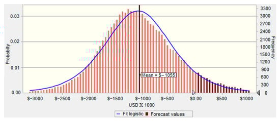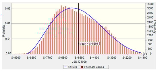 With the probability distributions, the risk of the project becoming unfeasible was quantified from a Monte Carlo simulation with 30,000 trials and a confidence level of 95%, considering the lower permissible limits of the economic decision criteria, which are net present value (NPV) > USD 0.00 and MARR > 10.32% APR. Other relevant factors during the economic feasibility analysis for the power system based on air as the gasification agent are described in Table 7.