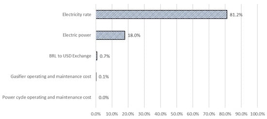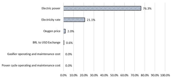 Like the system that uses air, Figure 15 shows that the project’s NPV is dependent on the electricity rate and the net electric power delivered, while the BRL to the USD exchange rate as well as the operation and maintenance costs had a minimal effect on the economic viability of the system. Therefore, the Rankine cycle/gasifier system using oxygen as a gasification agent will be viable if the electricity tariff is at least 4.40 BRL/kWh.