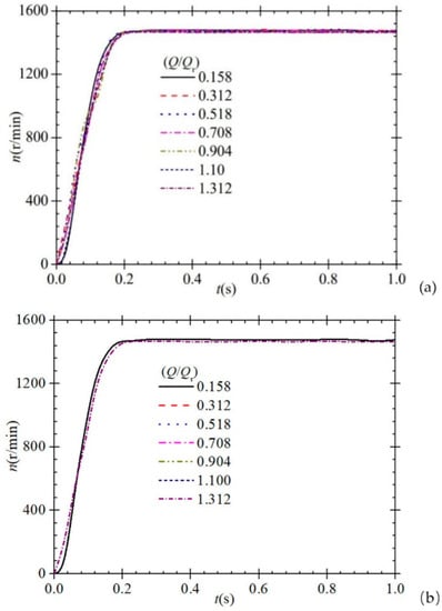 Figure 2 shows the rising characteristics of the transient rotational speed during the power frequency startup. For a centrifugal pump, as its outlet valve opening increases, the output torque needs to increase, which theoretically affects the rising characteristics of the motor speed. It can be seen from Figure 2a that the rising trend of the rotational speed was approximately linear at seven valve openings, while the differences among them were very tiny, and seven rotational speed curves rose to the final stable values at about 0.20 s. When the flow ratio Q/Qr was 0.158 (Qr is the rated flow rate), the rotational speed was the highest, about 1480 r/min; and when the flow ratio Q/Qr was 1.312, the rotational speed was the lowest, about 1464 r/min. The intermediate range was approximately linear; i.e., the stable rotational speed at the end of the starting process showed a gradual and slight downward trend with the increase of the valve opening. This can be seen more clearly in Figure 2b, which also illustrates that there was a slight lag in the time node at which the speed reached stability as the valve opening increased. In short, the change in rotational speed was not obvious, despite the valve opening.
