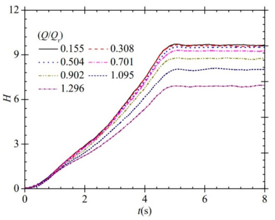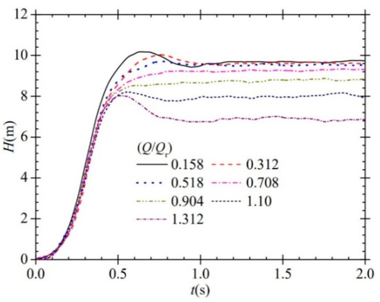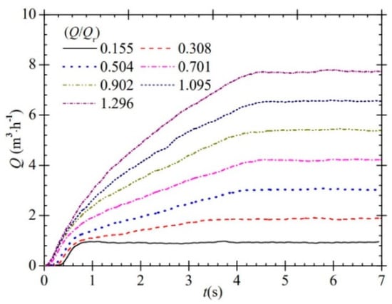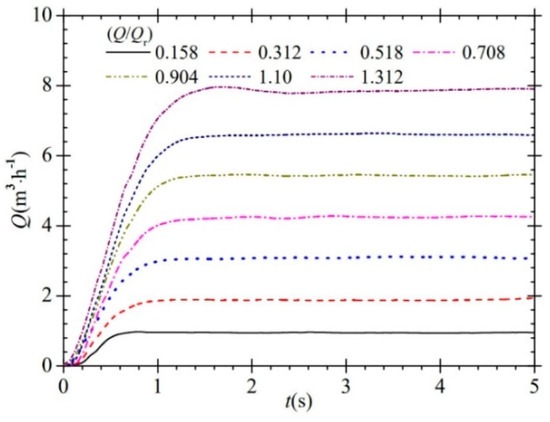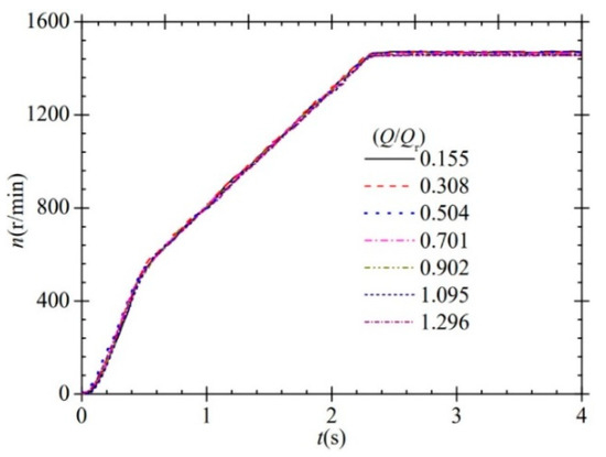 The basic characteristics shown in Figure 3 are that the rise rating was relatively slow at the beginning of the startup period and then rose rapidly. As the flow approached the stable value, the rising rate decreased again and finally reached a stable level. When the flow ratio Q/Qr was 0.158, 0.312, 0.518, 0.708, 0.904, 1.100, and 1.312, the time required for the flow to rise to a stable value was about 0.70 s, 1.0 s, 1.10 s, 1.30 s, 1.40 s, 1.40 s, and 1.60 s, respectively. It can be seen that the time required for the flow to rise to the stable value was significantly greater than the time required for the rotational speed to rise to the stable value. Furthermore, with the increase of the valve opening, the time required for the flow to rise to the stable value also showed a gradually increasing trend. The rising characteristics of the head during the power frequency startup are shown in Figure 4. Under seven different valve openings, the head curves rose to a stable value of approximately 9.76 m, 9.67 m, 9.55 m, 9.27 m, 8.83 m, 8.03 m, and 6.87 m respectively. As can be seen, the stable head decreased gradually with the increase of the valve opening.