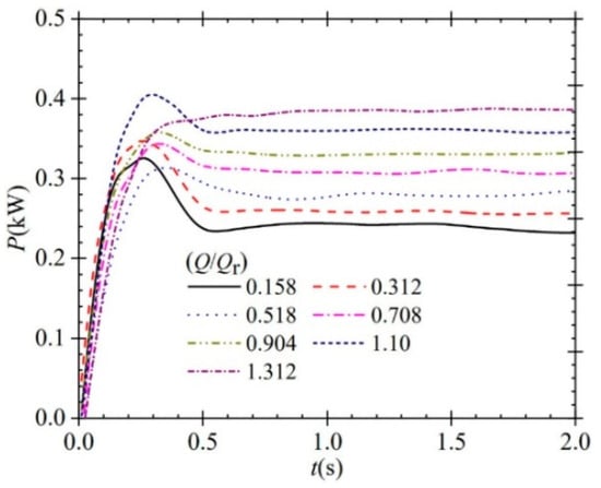 In the present experiment, a JC0-type torque speed sensor with a rated torque of 5 N·m was installed between the model pump and the motor to measure the transient rotational speed and transient torque. The shaft power of the centrifugal pump was calculated using the measured rotational speed and torque, as shown in Figure 5. It was found that, except for the flow ratio of 1.312, the other six shaft power curves showed a relatively obvious power shock phenomenon. When the flow ratio was 0.158, 0.312, 0.518, 0.708, 0.904, and 1.100, respectively, the time of shaft power impact was about 0.30 s, and the corresponding maximum shaft powers were about 0.325 kW, 0.347 kW, 0.314 kW, 0.345 kW, 0.358 kW, and 0.407 kW, respectively. They all dropped to the stable value at about 0.60 s, and the corresponding stable shaft power values were about 0.242 kW, 0.258 kW, 0.278 kW, 0.308 kW, 0.331 kW, and 0.361 kW, respectively. The corresponding shock power (defined as the difference between the maximum shaft power and the stable shaft power) was 0.083 kW, 0.089 kW, 0.036 kW, 0.037 kW, 0.027 kW, and 0.046 kW, respectively. When the flow ratio was 1.312, there was no obvious shaft power impact phenomenon, and the shaft power curve rapidly rose at the beginning of startup; the final stable value was about 0.386 kW.
