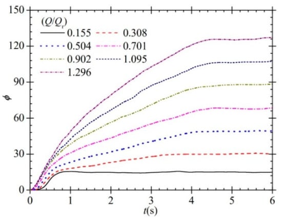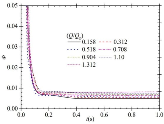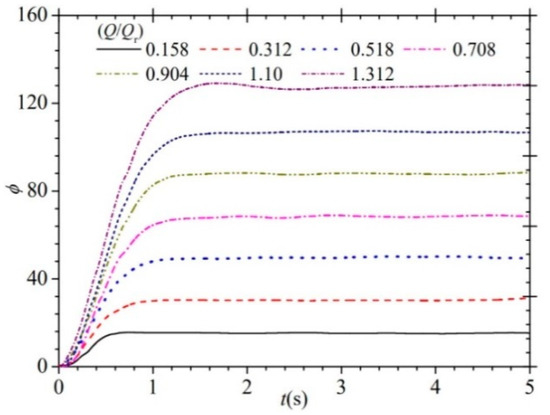 The transient dimensionless flow during frequency conversion startup is shown in Figure 13. All the transient dimensionless flow curves showed a continuous upward trend overall until they rose to stable values. Furthermore, as the valve opening increased, the time required for the transient dimensionless flow to rise to a stable value also increased gradually. Comparing Figure 13 with Figure 6 (the transient flow during frequency conversion startup), it can be seen that the shape of the two curves is essentially the same and the time steps of the curve change remain highly consistent. Similar to the power frequency startup, the time required for the dimensionless flow to rise to a stable value during frequency conversion startup lagged significantly behind the corresponding rise in rotational speed. When the flow had gradually risen to a stable value, the rotational speed was already in a stable state. The test results for dimensionless flow and flow could remain highly consistent over time and in a curved shape during frequency conversion startup.