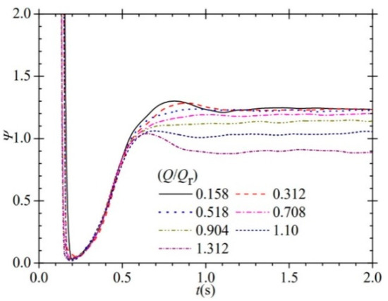 Figure 11 shows the time evolution of the transient dimensionless head in the process of power frequency startup. During the power frequency startup period, all the transient dimensionless head curves first decreased rapidly, then rose slowly, and finally, they fluctuated near the stable value. At the beginning of startup, there was a maximum value of transient dimensionless head, which then rapidly decreased to a minimum value at about 0.20 s. The occurrence of maximal values at the beginning of the startup process can be explained as follows: the sudden rotation of the impeller after startup produces a pressure shock to the stationary water volume. Compared with Figure 4, it can be seen that the rising characteristics of the head curves and the transient dimensionless head curves were basically similar after about 0.20 s, but there was a significant delay in time. For flow ratios of 0.158 and 0.312, the time for the transient dimensionless head curve to rise to the stable value was approximately 1.10 s. For flow ratios of 0.518, 0.708, and 0.904, this was approximately 1.0 s. When the flow ratios were 1.10 and 1.312, this was about 0.90 s. It can be seen that the time required for the transient dimensionless head curves to change to stable values decreased with the increase of the valve opening. Of these, the transient dimensionless head curves also showed a more obvious shock when the flow ratio was 0.158, 0.312, 1.10, and 1.312, respectively.