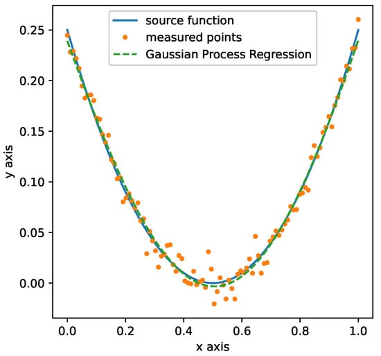 Presented here is an example of using these tools to find the minimum of an objective function. A trivial benchmark function, Equation (12), is used to generate 100 random normally distributed data-points that represent the source function. These data are then used to train and validate a GPR; both the source function and the GPR are then used to find the minimum value of the function. This GPR model has a high performance with an of 0.981. Source function, generated data, and the GPR model are visualized in Figure 2.