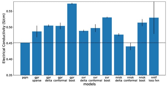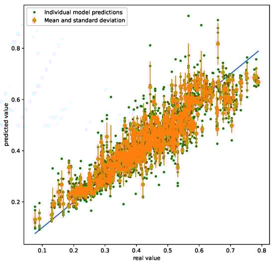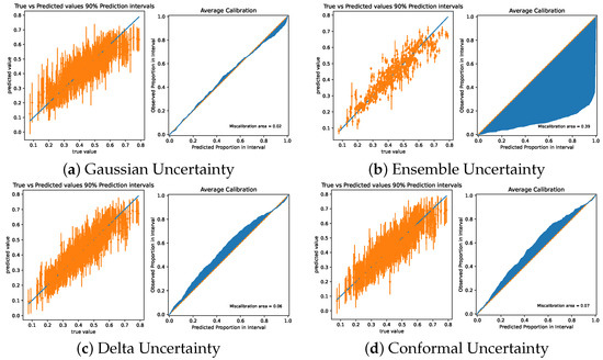 Conformal prediction (CP) is a model agnostic method that produces well-calibrated uncertainty band for each prediction []. CP uses a predefined nonconformity function to score each training point on the level of conforming, or the similarity to other points of the same label or value. This conformity score serves as a metric in comparing one data point to the rest of the set. A significance level is provided to the calculations to allow for proper calibration. The significance level and conformity scores are used to create an interval at a given significance level—for example, 95%. At the 95% significance level, 95% of the data falls within those prediction intervals, which would indicate proper calibration for an uncertainty method.