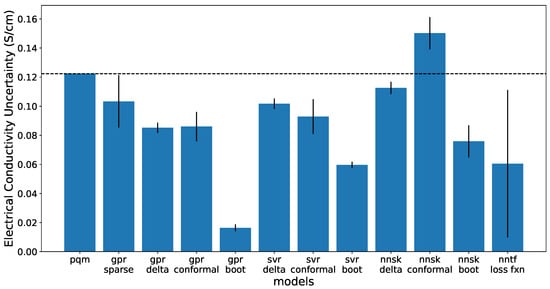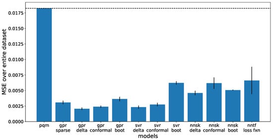 Mean squared error (MSE) is used as a comparison metric between the linear PQM model and the non-linear ML models. The MSE is taken over the entire dataset of 566 glass compositions. As seen in Figure 4, Each ML model performs significantly better than the PQM model. The highest performing models include the GPR with delta or conformal uncertainty.