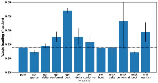 For adequate comparison, each of the models are fitted with five-fold cross validation. The dataset has 566 glass composition entries for the electrical conductivity property, with 20 composition features. For each cross validation, an 80–20 random split is used on the dataset; 80% of the data was sectioned off for training purposes, and 20% for testing. For uncertainty comparison, the 90% prediction interval is calculated for each model and UQ method combination; some UQ methods require another split of data be set aside during model training. A dotted line is present on all graphs showing PQM performance for comparison. Results presented in this study includes regression performance on the provided data-set, uncertainty calibration curves, property values with uncertainty values, optimization solve time, and the final waste loading. The objective of the optimization problem is to maximize final waste loading; doing so without giving up certainty or computational time is desired. For the ensemble methods, 20 models are trained and combined for each cross validation run, except for GPR due to the longer computation time, where only 5 models are computed.