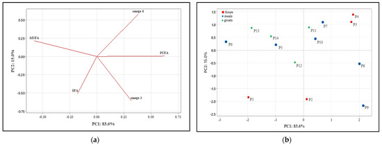 Principal component analysis: (a) score plot of first and second principal component (PC1 and PC2) describing the variability among the by-products analyzed; (b) loading plot of PC1 and PC2 describing the variation between the fatty acid composition of by-products.
