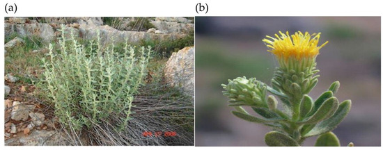 V. iphionoides belong to the Asteraceae family, the genus Chiliadenus, and is growing all throughout the Eastern Mediterranean. The 20–50-cm-long V. iphionoides has small leaves and a woody base with several branches. It features tubular yellow blooms and sticky stems. The period of blooms for this plant is in September and December [29]. Wild populations of V. iphionoides can be found in rocky terrain, deserts, and harsh deserts in the Mediterranean, Sahara, and Iran. It is found in Palestine, Jordan, Syria, and Lebanon, among others. Traditional medicine has frequently employed V. iphionoides for a variety of medical conditions, including kidney stones, stomach disorders, diabetes, eye infections, and problems with male and female fertility. Additionally, V. iphionoides has demonstrated a variety of pharmacological therapeutic activities, including anticancer, antibacterial, antioxidant, and antiplatelet activity and in the treatment of inflammation that leads to cancer, especially prostate cancer [30,31,32].